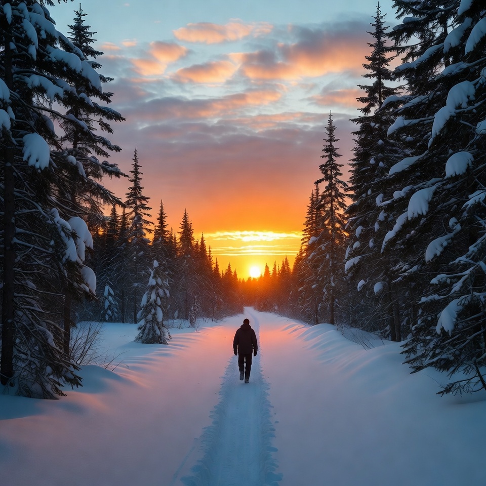A man in a dark jacket walks away down a narrow snow-covered path flanked by snow-laden pine trees. The scene is illuminated by a vibrant sunset with orange and pink hues in the sky filtering through the forest. The path leads toward the glowing sun low on the horizon.