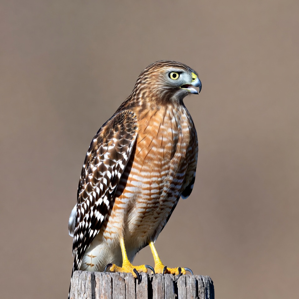 avian, bird, bird of prey, brown feathers, feathers, hawk, isolated background, nature, perch, raptor, talons, white stripes, wildlife, wooden post, yellow beak, yellow eyes, yellow legs, red-shouldered hawk