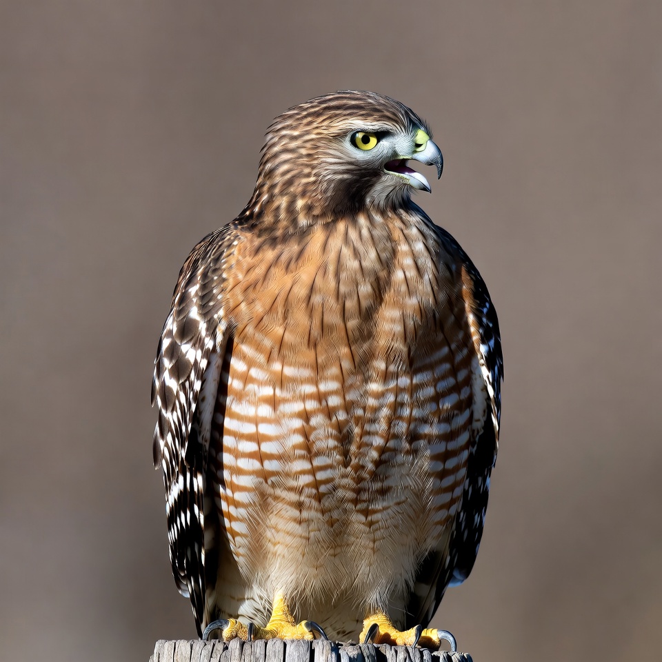 avian, bird, bird of prey, brown feathers, feathers, hawk, isolated background, nature, perching, predator, raptor, talons, white stripes, wildlife, wooden post, yellow beak, yellow eyes, red-shouldered hawk