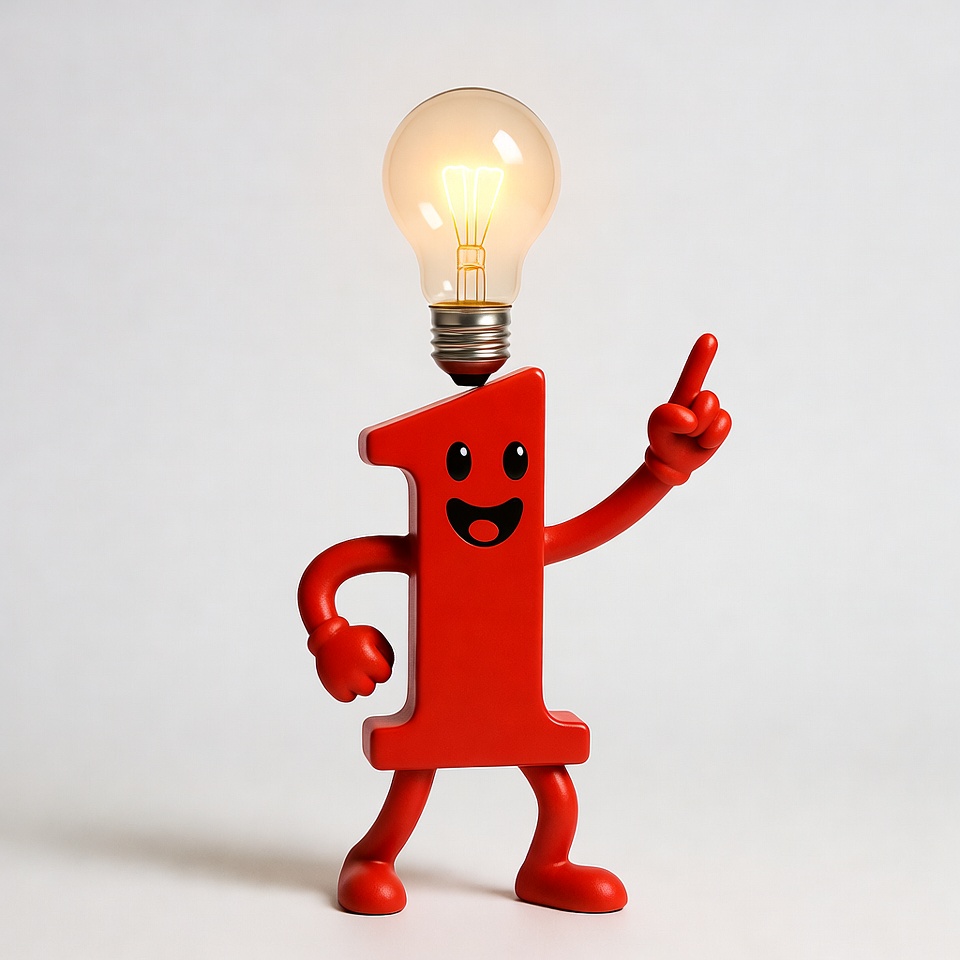 3D render, animated number, cartoon character, clipart, cute illustration, glowing bulb, happy expression, isolated background, lightbulb head, number 1, pointing finger, red character, red number, smiling face, number one