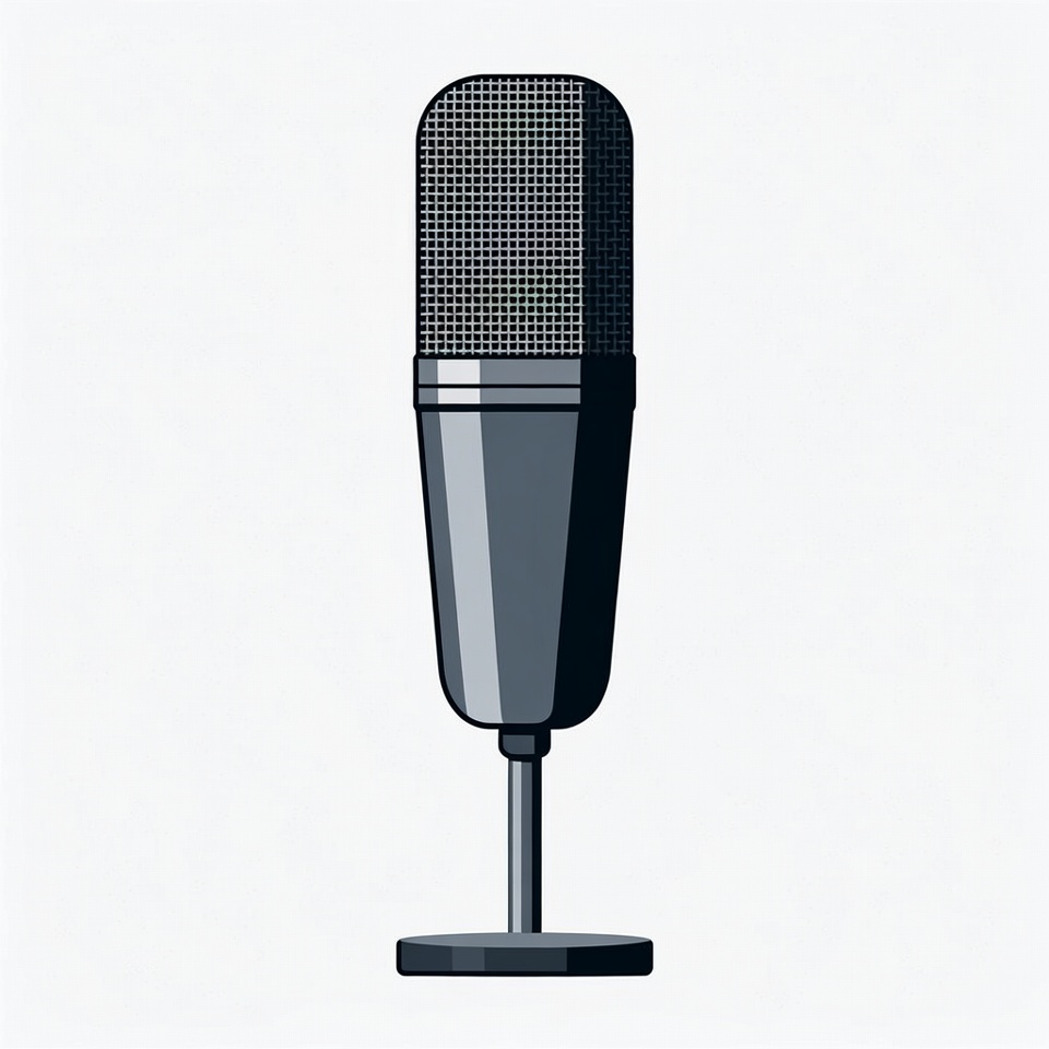 A black clipart illustration of a microphone stands on a thin metal stand against a white background. The microphone features a rounded grille top and a cylindrical body with a subtle shine. The base is circular and flat.