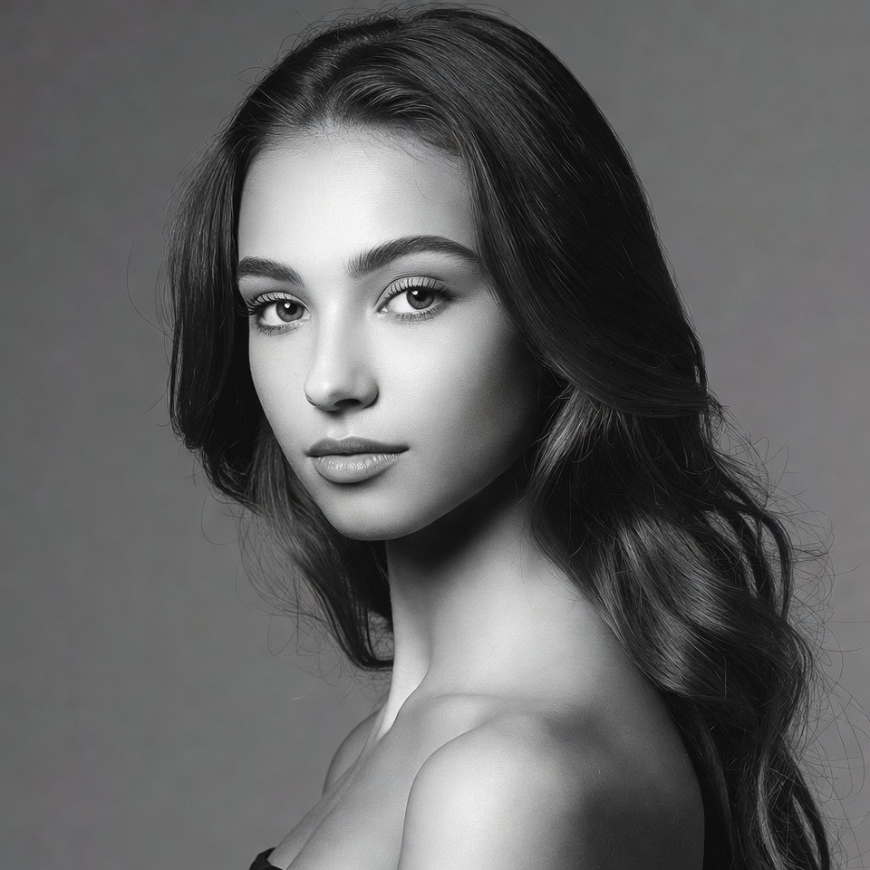 Multiracial, beautiful, black and white, dark hair, eyes, face, female, headshot, lips, long hair, monochrome, portrait, shoulders, studio photo, wavy hair, young woman, woman