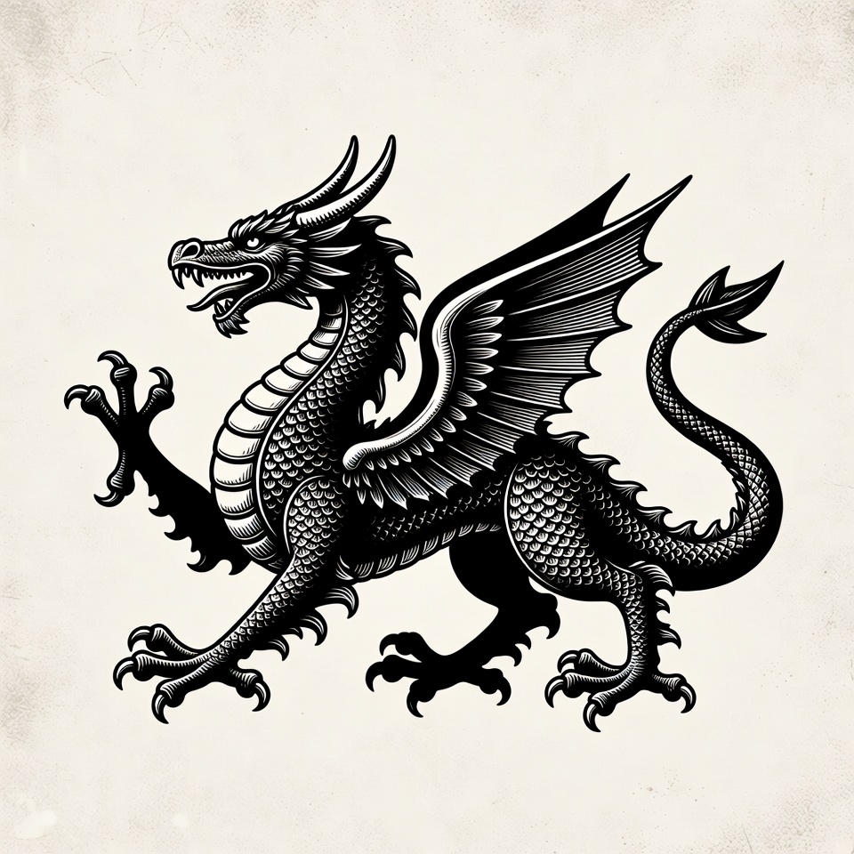 aggressive pose, black ink, claws, detailed drawing, fantasy, fierce, horns, illustration, isolated background, line art, mythical creature, roaring, scales, standing dragon, tattoo design, vintage style, wings, dragon