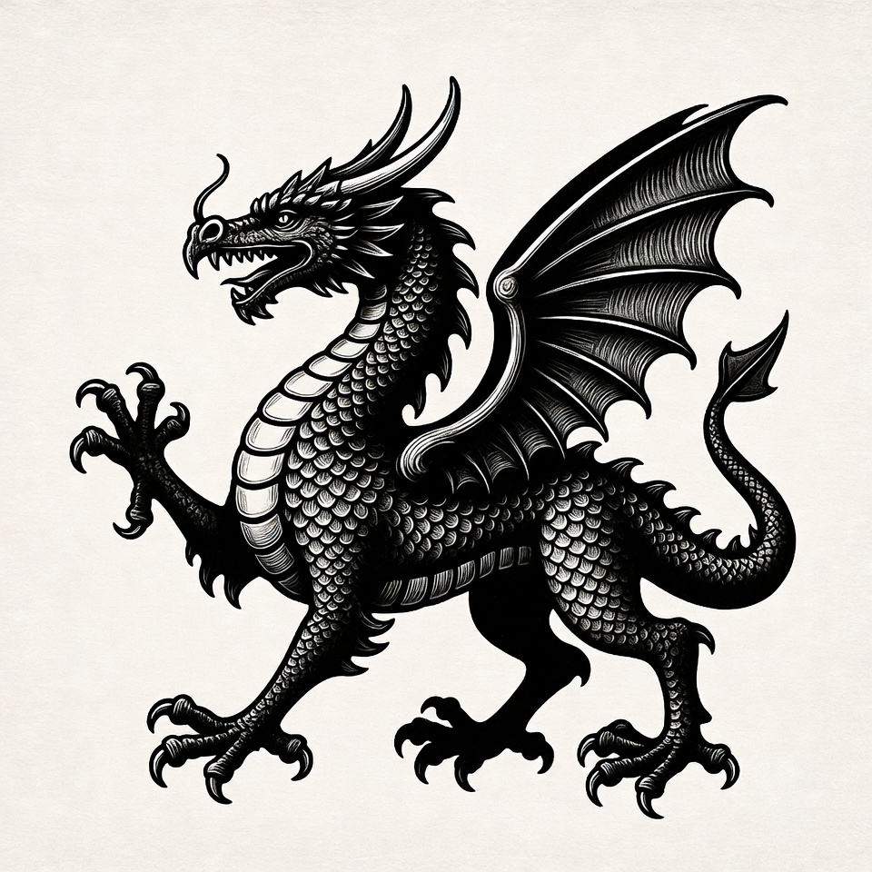 black ink, detailed scales, fantasy art, fierce dragon, heraldic dragon, horns, illustration, ink drawing, isolated background, line art, mythical creature, roaring dragon, scales, sharp claws, standing dragon, vector dragon, wings spread, dragon