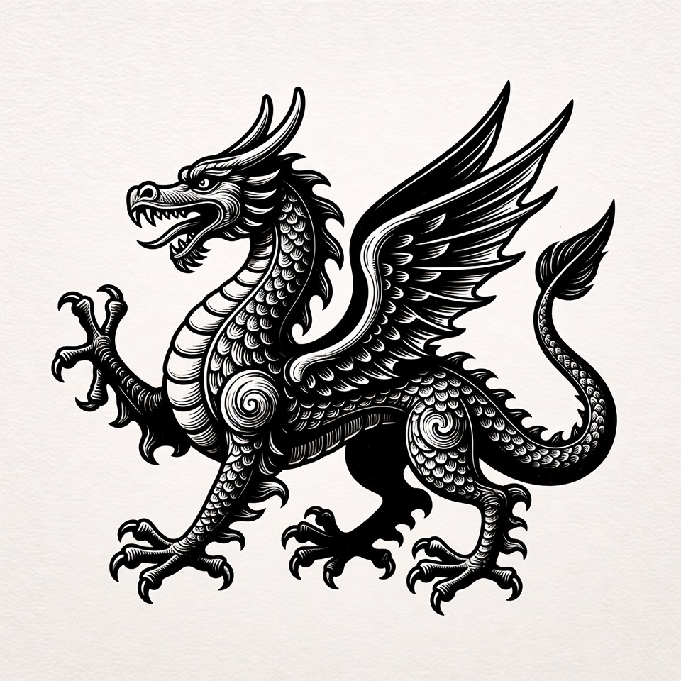 black ink, claws, detailed dragon, engraving style, fantasy art, fierce dragon, horns, illustration, isolated background, line art, mythical creature, roaring dragon, scales, sharp teeth, snarling, spread wings, standing dragon, vector art, wings, dragon