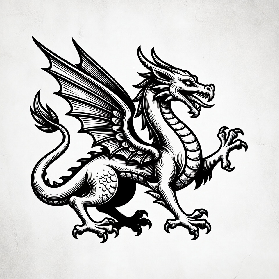 black ink, claws, detailed line art, emblem, fantasy, fierce, horns, illustration, isolated background, mythical creature, roaring, scales, standing, vector art, wings, dragon