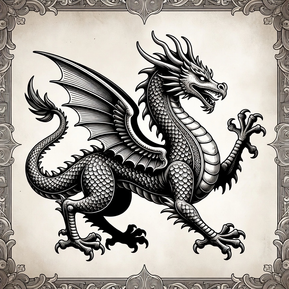 black dragon, chinese dragon, claws, clipart, detailed dragon, dynamic pose, engraving style, fantasy art, fierce dragon, horns, illustration, ink art, isolated background, line art, medieval dragon, mythical creature, ornate frame, red eyes, roaring dragon, scales, standing dragon, tail, tattoo design, vector art, wings, dragon
