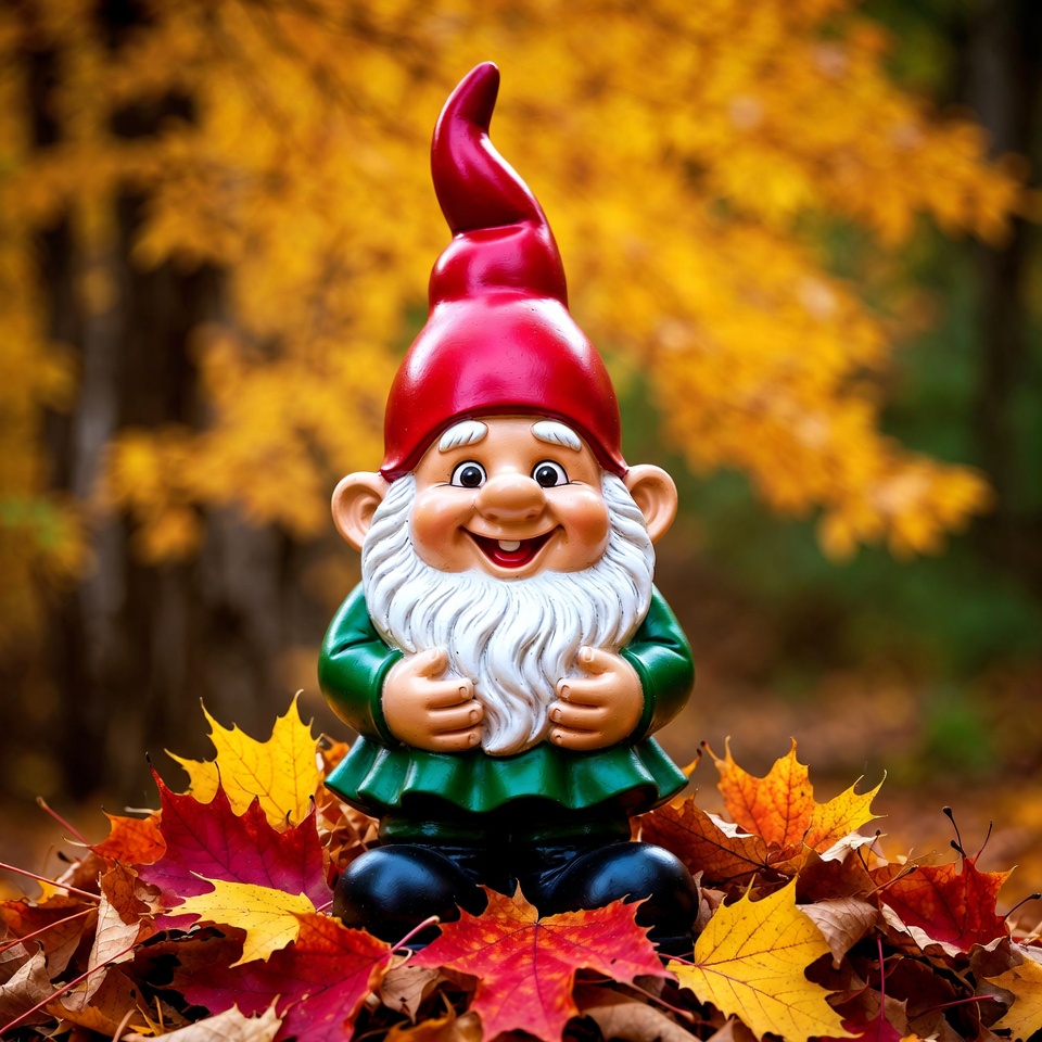 autumn forest, autumn leaves, autumn scene, bearded gnome, black shoes, fall decoration, fall leaves, foliage, gnome, gnome figure, green clothes, happy face, leaf pile, nature background, orange leaves, outdoor gnome, pointed hat, red hat, seasonal gnome, smiling gnome, statue, vibrant colors, white beard, woods, yellow leaves, garden gnome