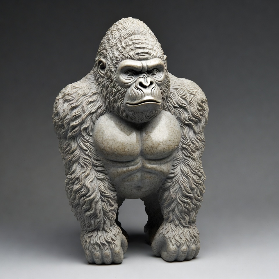 A detailed stone sculpture of a muscular gorilla stands on a plain background. The gorilla has realistic gray fur texture, intense eyes, and a powerful chest. It poses frontally with arms slightly forward.