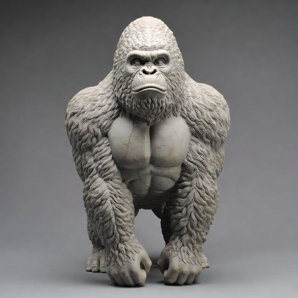 animal sculpture, ape statue, detailed sculpture, fierce gorilla, gorilla statue, gray fur, muscular gorilla, powerful animal, primate sculpture, realistic gorilla, sculpture, silverback gorilla, standing gorilla, wildlife art, gorilla
