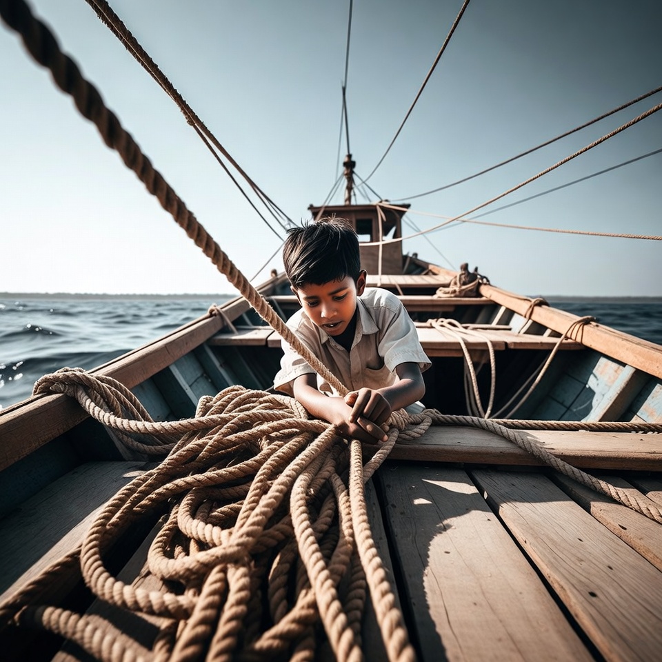 Asian boy, boat, child, coils, deck, fishing boat, horizon, kid labor, kneeling, maritime, ocean, rigging, ropes, sailing, sea, short hair, sky, water, white shirt, wooden boat, working, young boy, boy