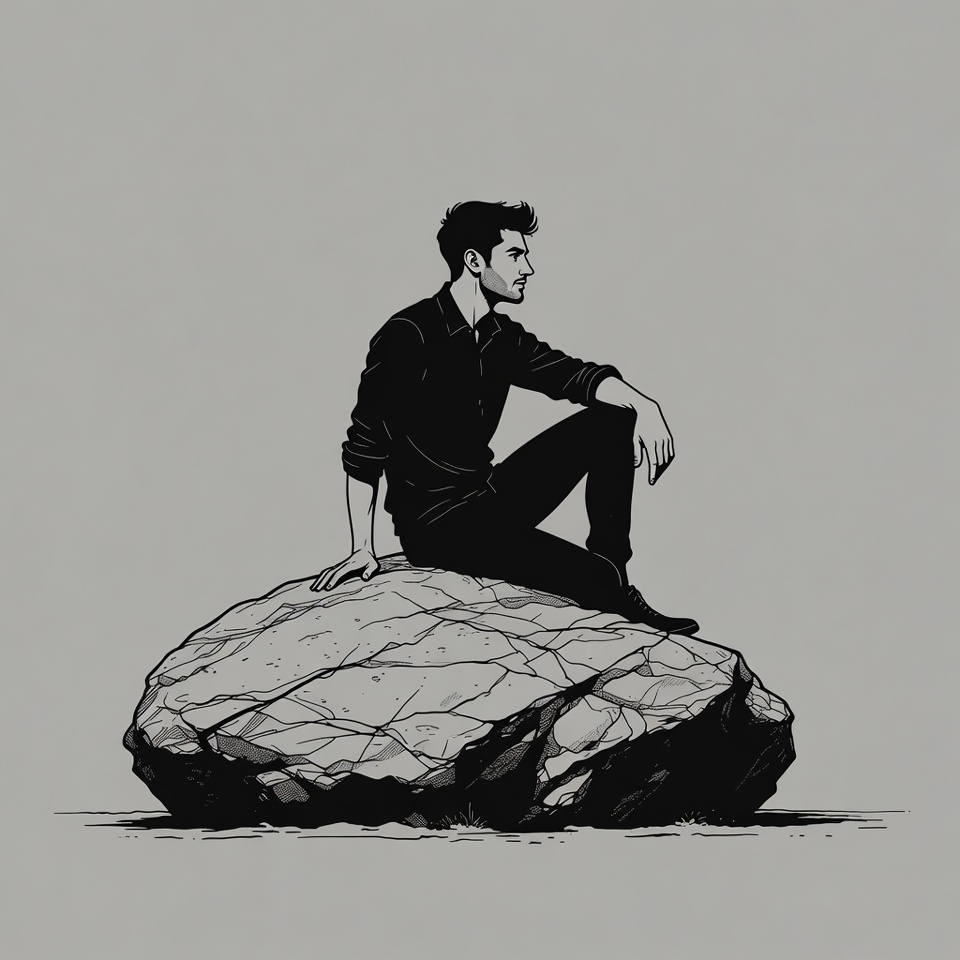 A black ink illustration depicts a man with short hair sitting cross-legged on a large rugged rock. He wears a collared shirt with rolled sleeves and pants, leaning back with one arm resting on his raised knee. The scene is rendered in a minimalist line art style against a light gray background.
