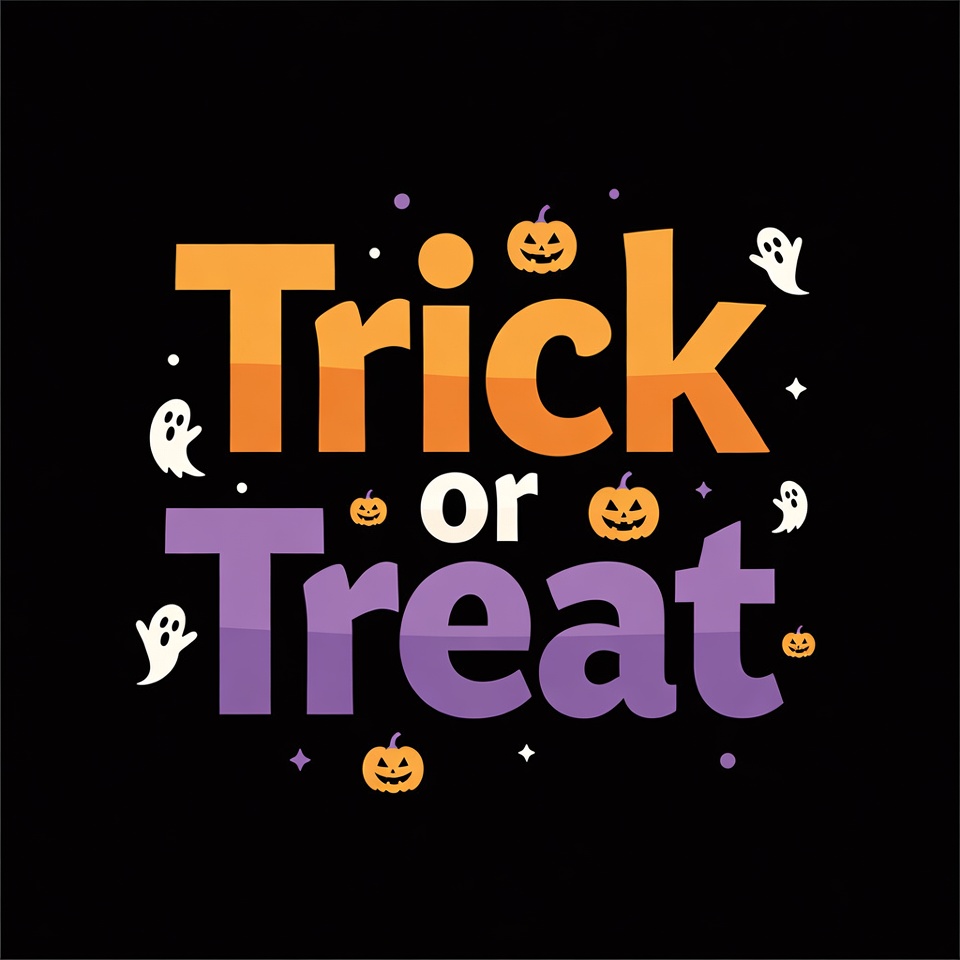 Colorful illustration features 'Trick or Treat' text in orange and purple bold letters on a black background. Surrounding elements include carved pumpkins and white ghosts. Stars and sparkles add a festive Halloween touch.