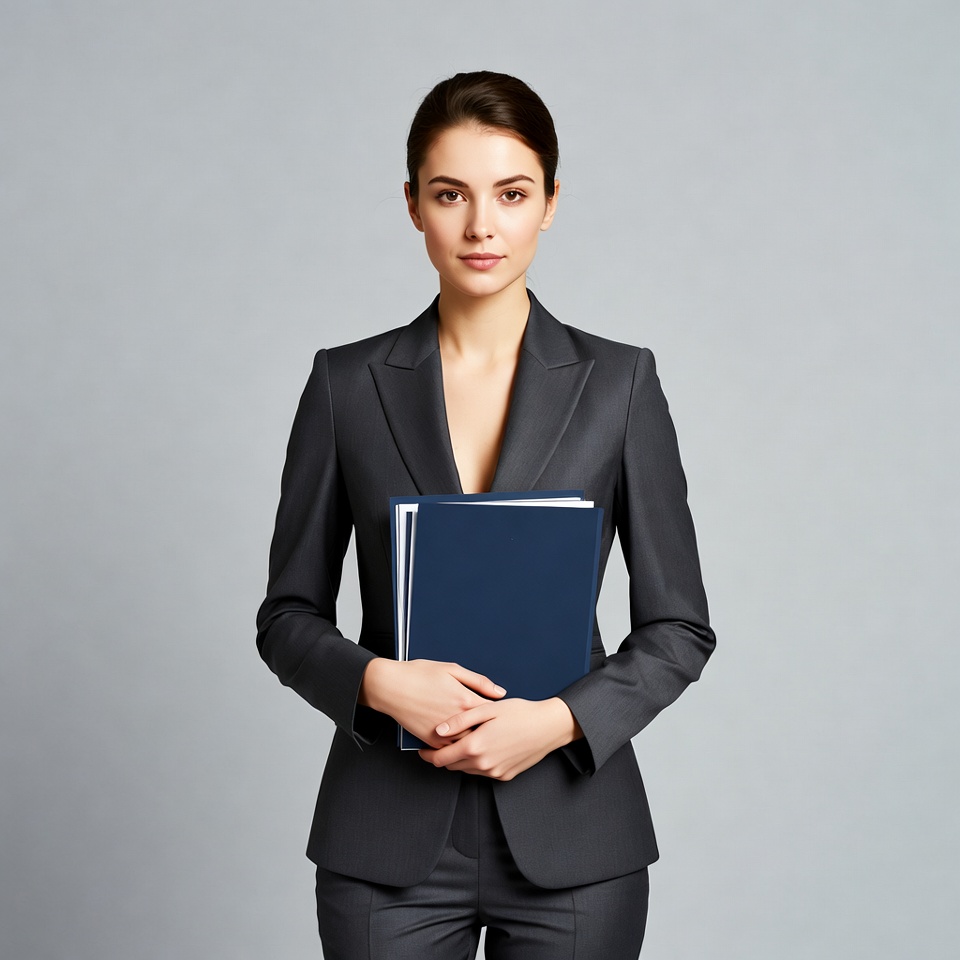 A young woman with dark brown hair in a bun stands confidently against a gray background. She wears a tailored black business suit with a deep V-neck and holds two navy blue folders stacked in her hands. Her expression is professional and poised.