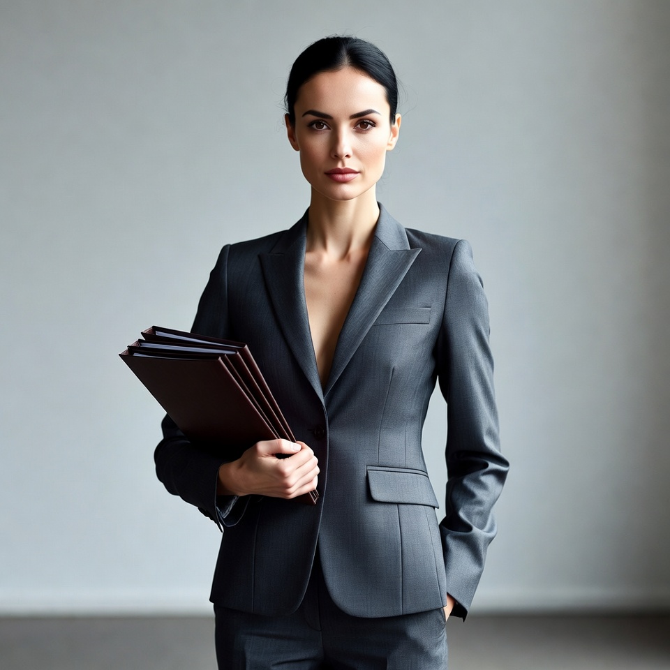 A woman with dark hair in a bun stands confidently in a gray suit jacket with a deep neckline. She holds a stack of brown leather folders in her right hand against her gray skirt. The image features a plain gray background.