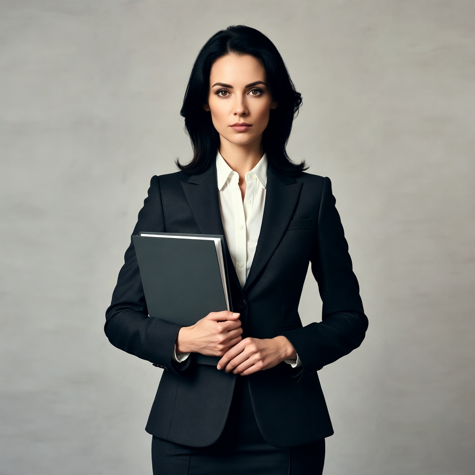 A woman with long dark hair stands confidently against a gray background, wearing a black business suit and white collared shirt. She holds a black folder in both hands in front of her. Her expression is serious and professional.