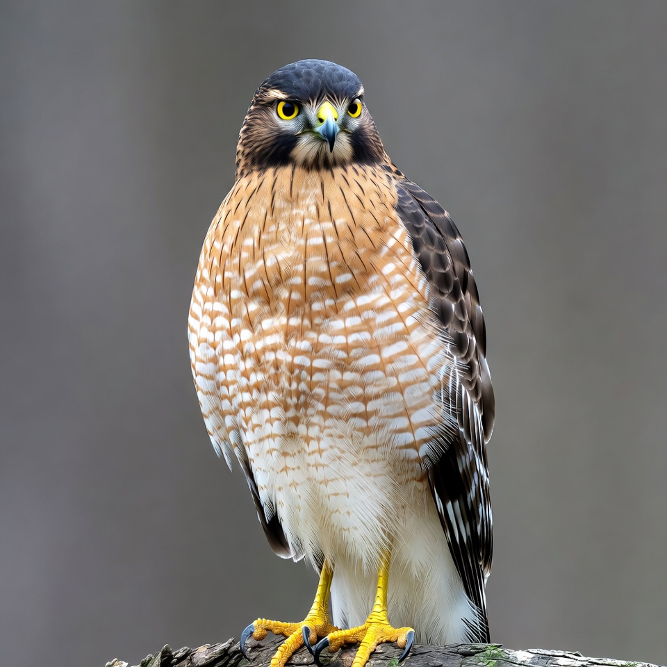 A Cooper's hawk with brown and white streaked plumage stands alert on a wooden branch. It features a dark cap, yellow legs, and piercing yellow eyes with a black beak. The bird faces forward against a blurred gray background.