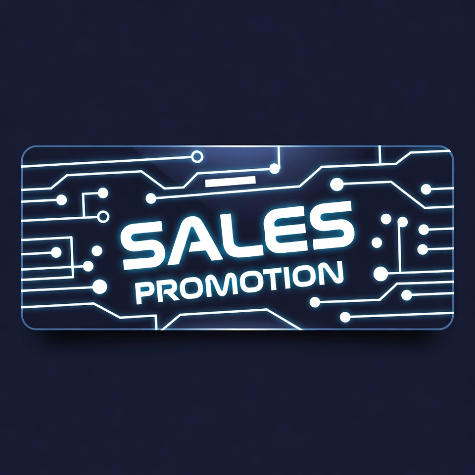 A digital illustration of a rectangular banner with 'SALES PROMOTION' text in bold, glowing neon blue font. The design features intricate circuit board patterns and glowing lines on a dark navy background. The text and circuits create a futuristic, high-tech appearance.