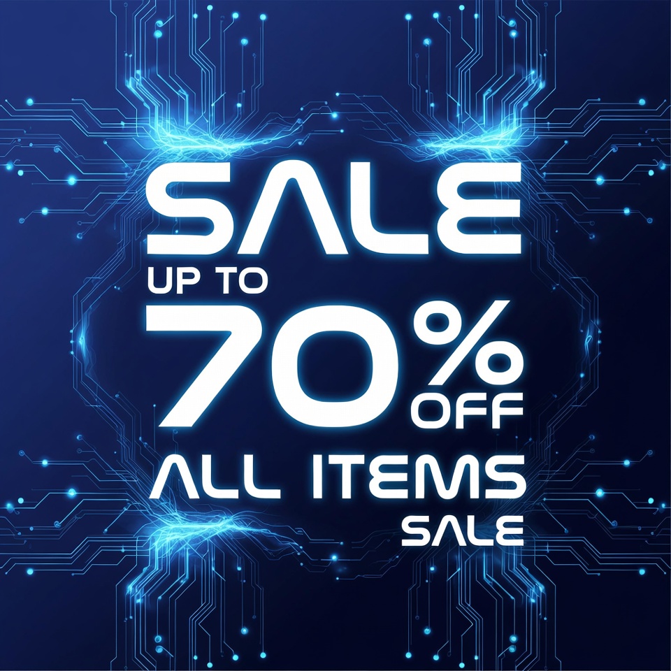 A digital graphic features bold white text announcing 'SALE up to 70% OFF ALL ITEMS SALE' centered on a dark blue background. Neon blue circuit board patterns and glowing electric effects frame the text. The futuristic design emphasizes the discount promotion.