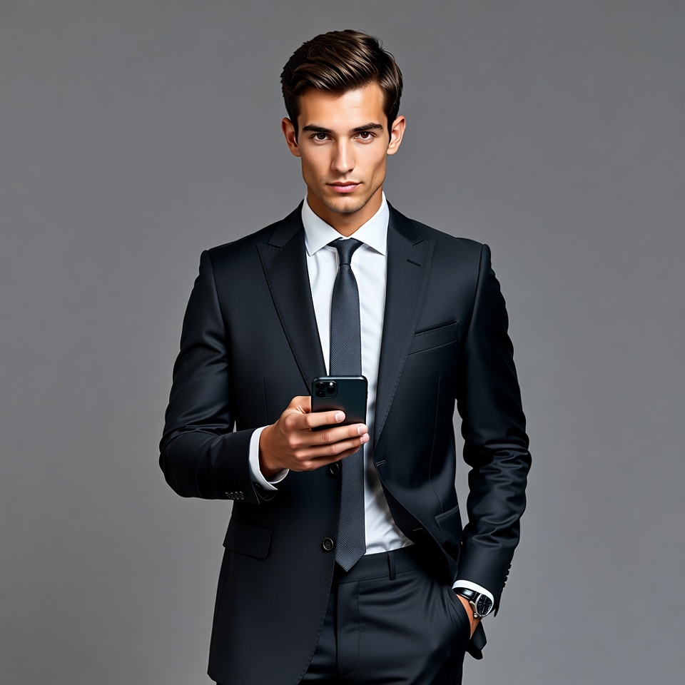 A young man with short dark hair and a serious expression stands against a gray background. He wears a black suit, white shirt, and gray tie while holding a black smartphone in his right hand. His left hand is in his pocket, showing a watch on his wrist.