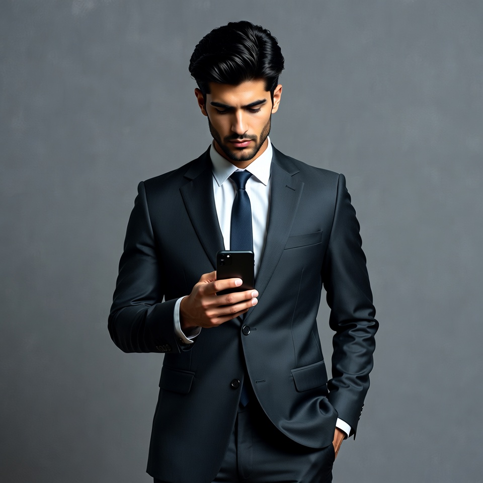 A young man with dark wavy hair and a beard stands against a gray background, wearing a black suit, white shirt, and blue tie. He looks down intently at his smartphone held in both hands. His jacket is neatly buttoned with cuffs visible.