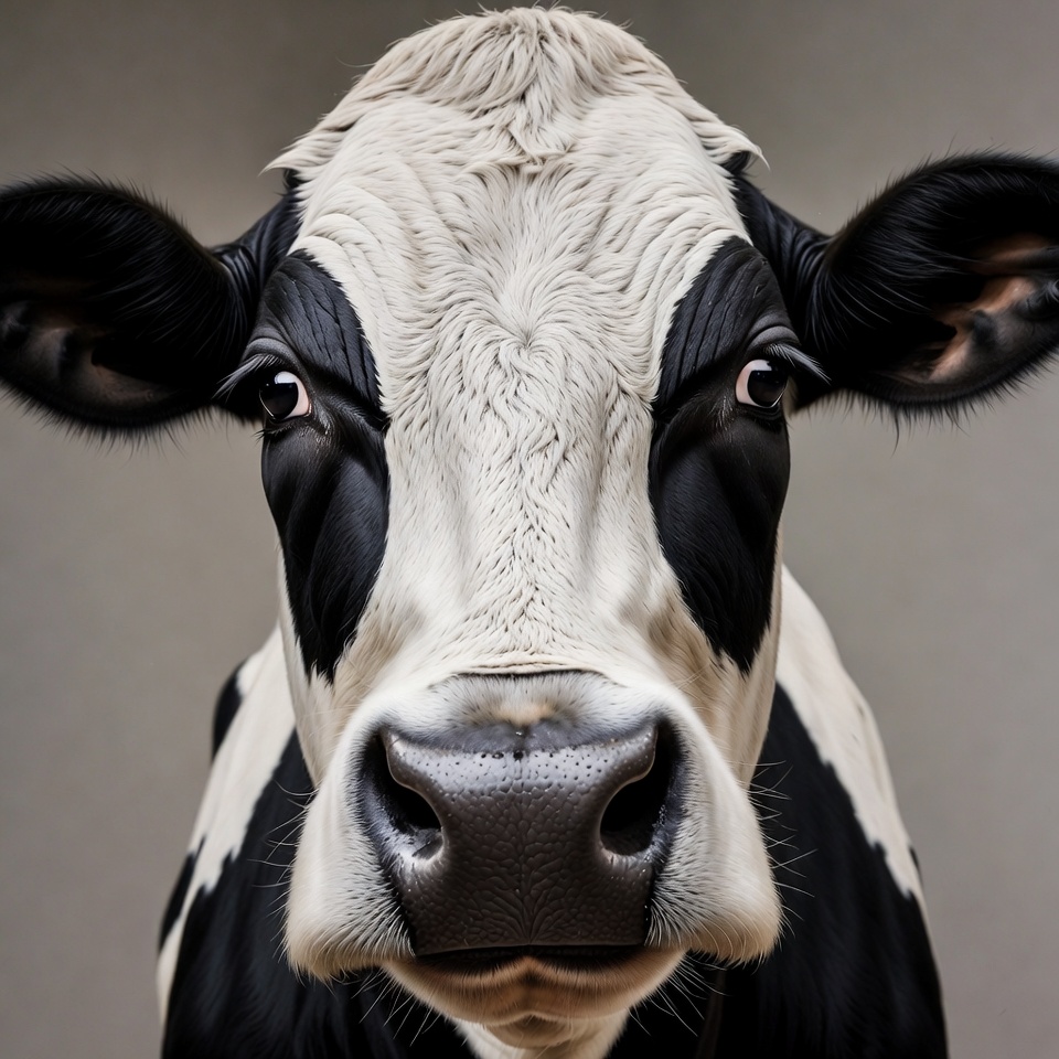 A Holstein cow with black and white markings stares directly at the camera. Its large dark eyes and pink nose are prominently featured against a plain gray background. The cow's floppy ears frame its detailed muzzle.