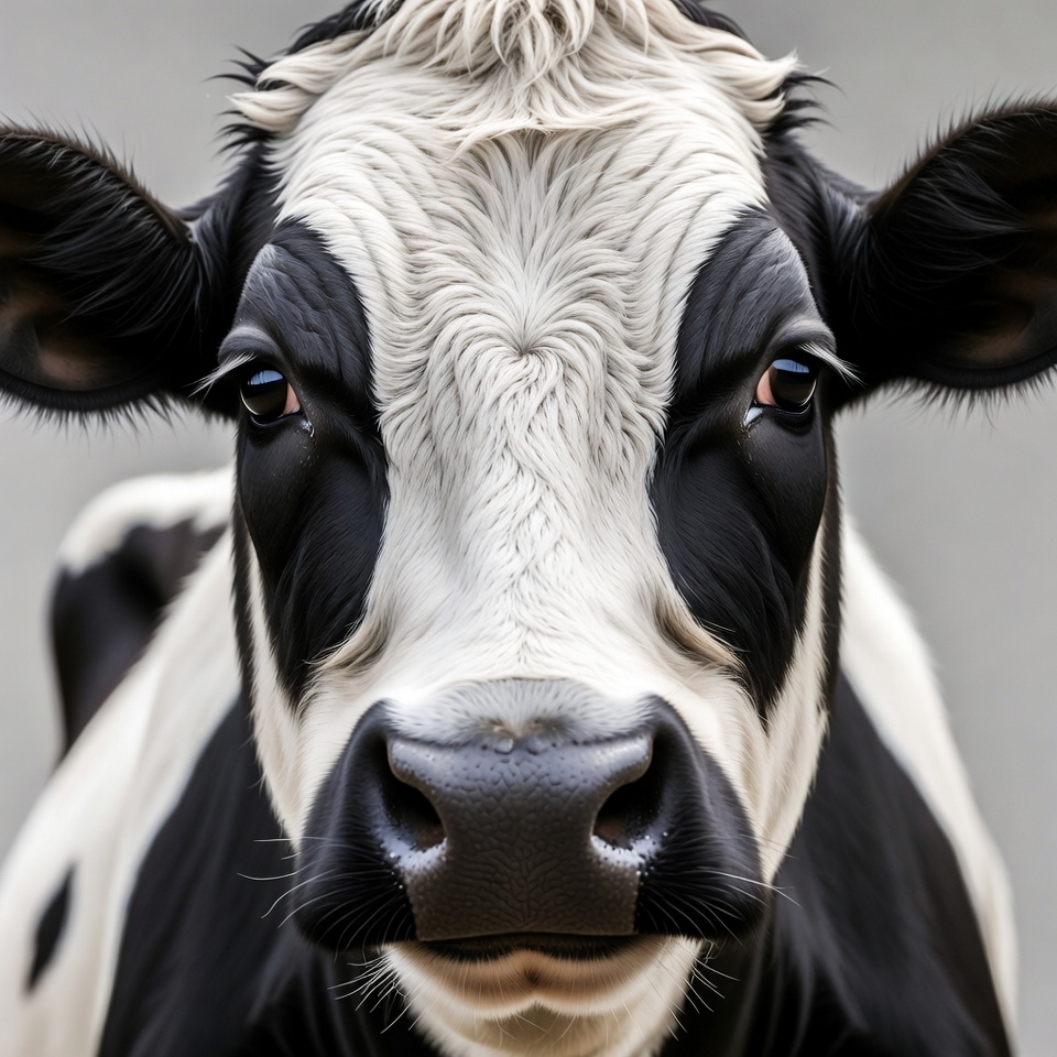 Holstein cow, animal portrait, black white cow, bovine, cattle, close-up cow, cow eyes, cow face, cow portrait, dairy cow, farm animal, fluffy fur, gray background, livestock, perked ears, wet nose, cow