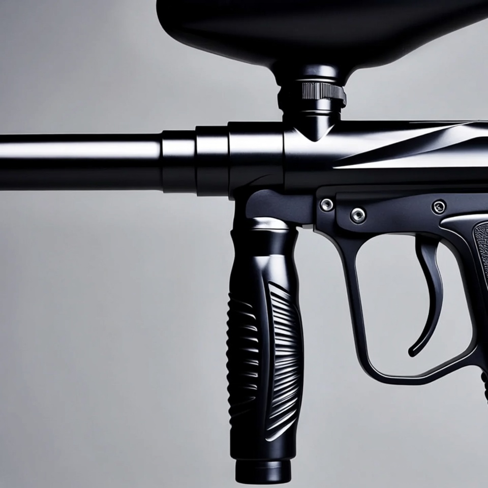 A sleek black paintball gun is shown in a close-up view against a gradient gray background. The marker features a paintball hopper on top, an extended barrel, and a textured ergonomic grip with trigger. Details include metallic accents and adjustment screws on the components.