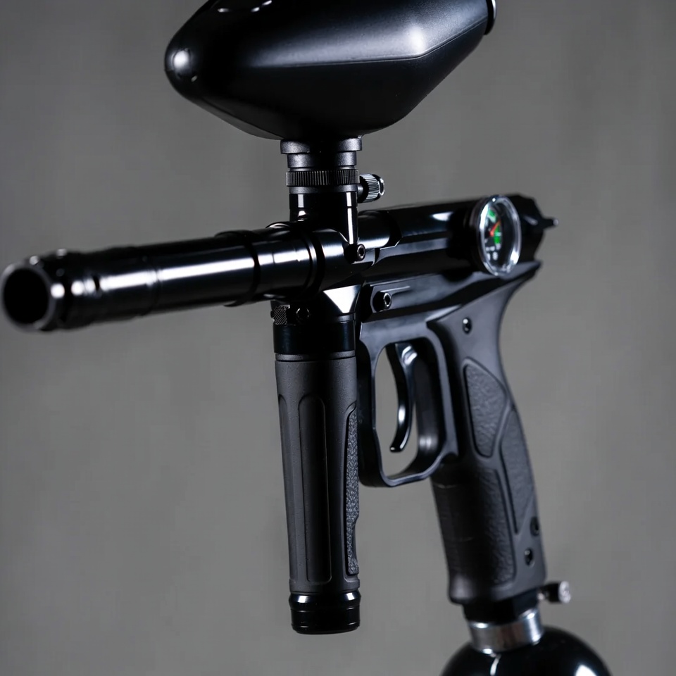air gun, airsoft gun, barrel, black paintball, gauge, grip, hopper, isolated background, marker, paintball hopper, paintball marker, paintball pistol, sport equipment, tactical gear, paintball gun