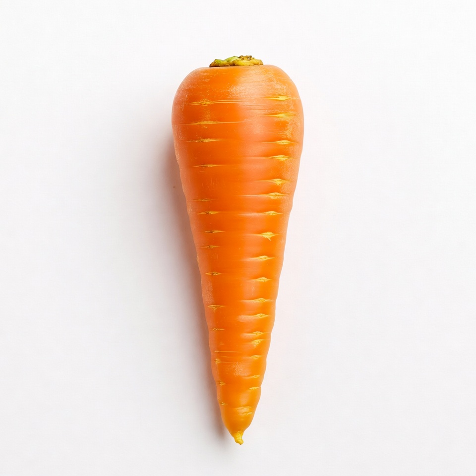 A single fresh carrot stands vertically on a white background. It features vibrant orange skin with textured ridges and a green top. The carrot tapers to a pointed tip.