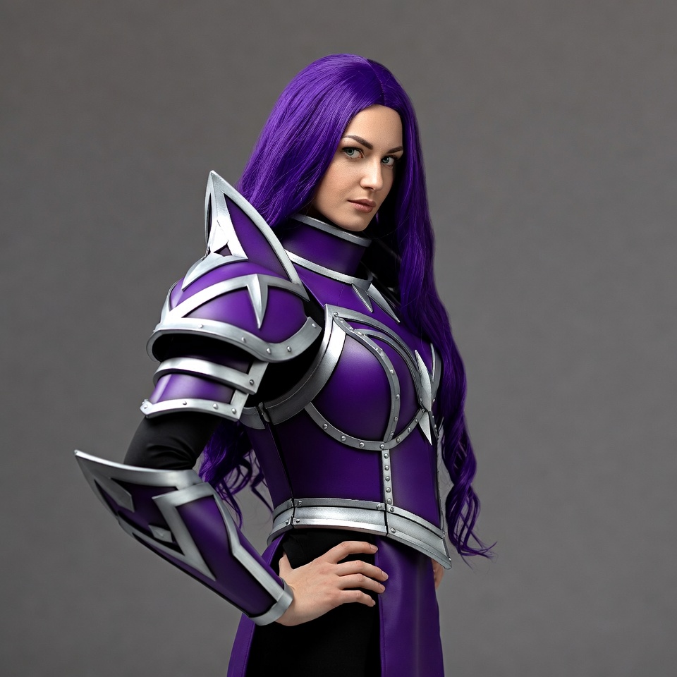 White, confident pose, cosplayer, fantasy armor, female, gray background, hand on hip, long hair, medieval armor, purple armor, purple hair, silver armor, spiked pauldrons, warrior woman, woman, cosplay