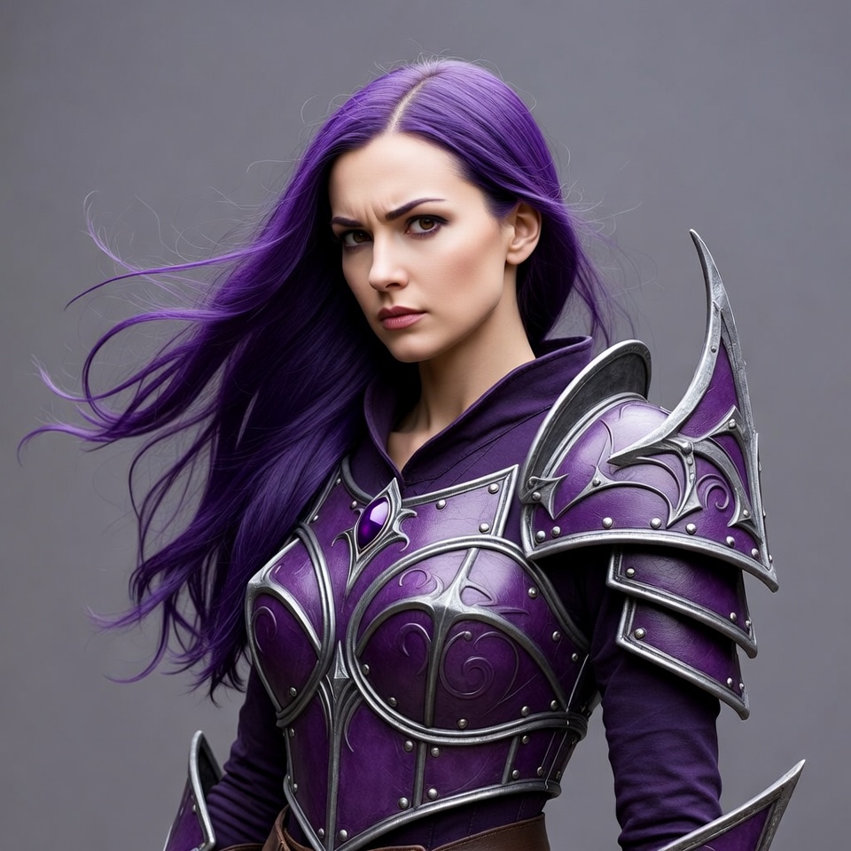 Purple-haired woman in fantasy armor