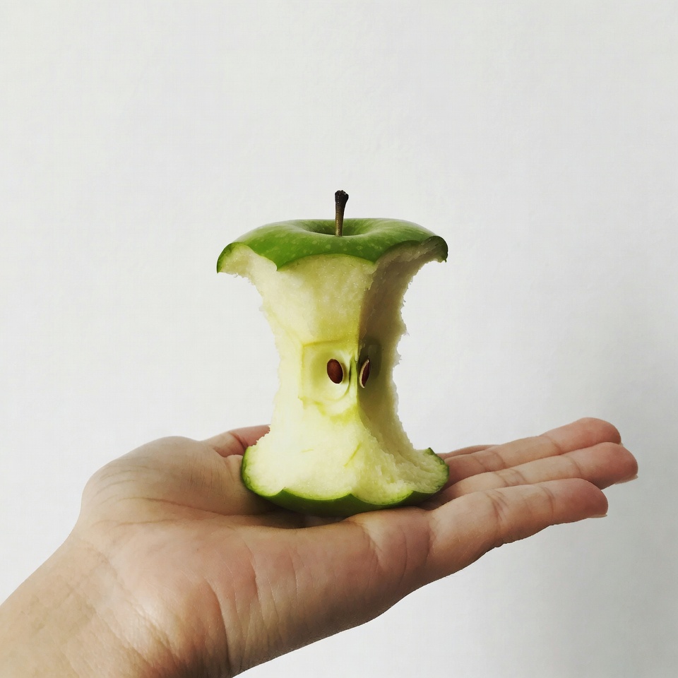 A hand holds a green apple with a large bite taken out of it, revealing the white flesh inside. The apple's core is visible with seeds, and it stands on a plain white background. The hand is positioned palm-up, showcasing the apple prominently.