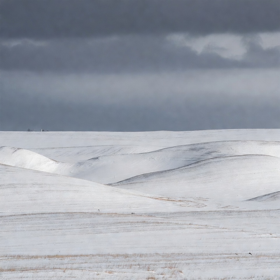 Snow-covered rolling hills stretch across a vast frozen landscape under a heavy gray cloudy sky. Gentle white dunes and subtle tracks mark the snowy terrain. Distant faint silhouettes appear on the horizon.