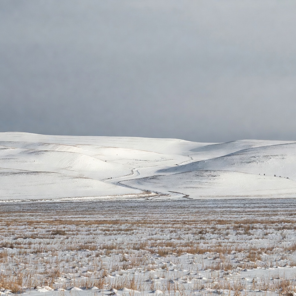 cloudy sky, dry grass, fields, fresh snow, gray sky, mountains, nature, outdoors, path, rolling hills, scenic view, snow, trail path, white snow, winding trail, winter landscape, snowy hills