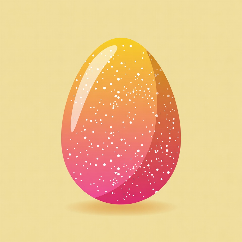 A glossy Easter egg with a vibrant gradient from pink to yellow sits on a plain beige background. It features sparkling white speckles across its smooth, reflective surface. The egg is centered and isolated for a clean, illustrative look.