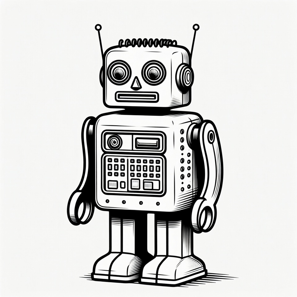 antennae, black and white, buttons, cartoon robot, clipart, control panel, drawing, humanoid robot, illustration, isolated background, joints, line art, machine, mechanical, retro robot, round eyes, sci-fi, vintage robot, robot