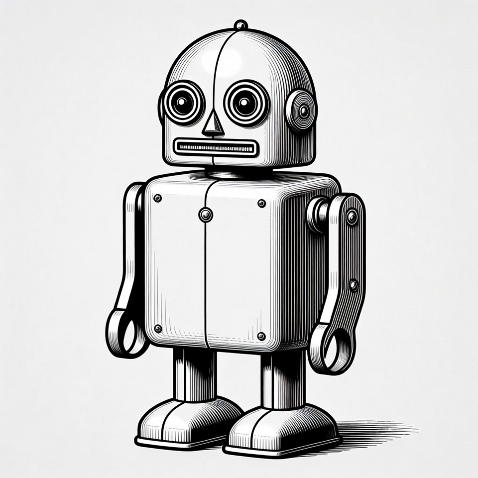 antenna, boxy body, engraving style, illustration, isolated background, jointed arms, line art, mechanical robot, retro robot, round eyes, silver robot, toy robot, vintage robot, robot