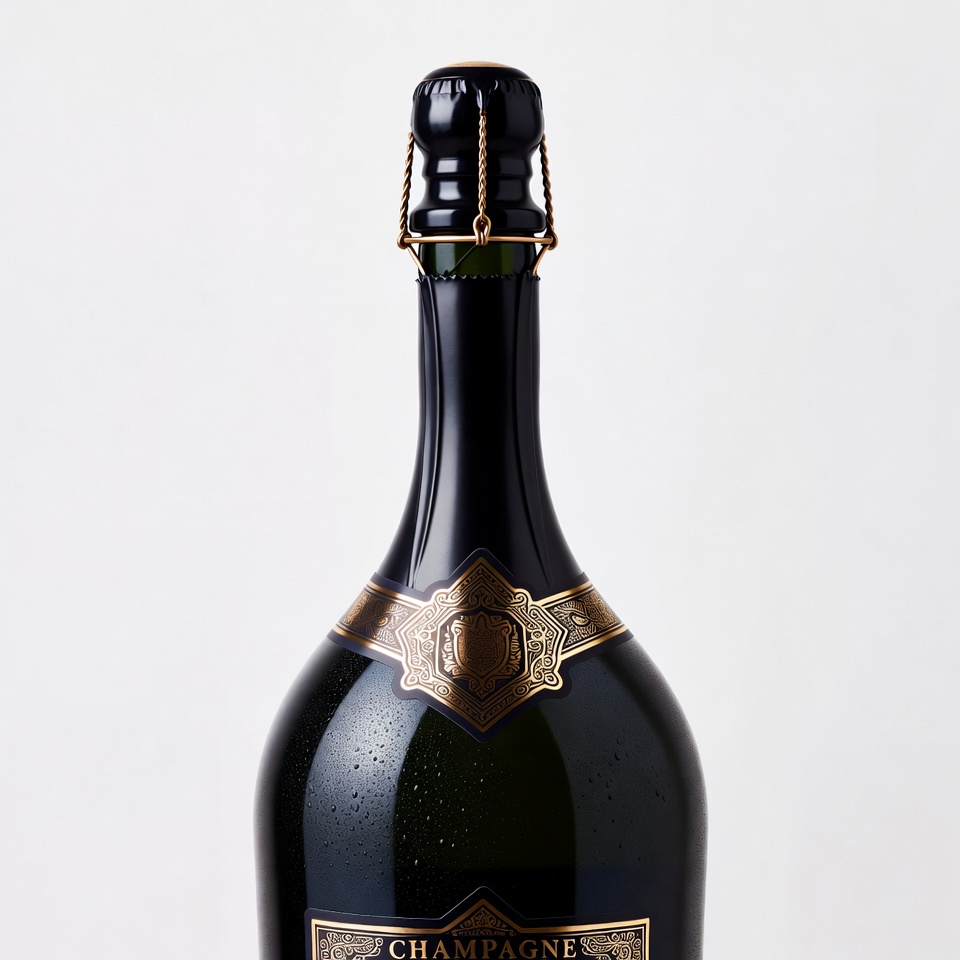 alcohol, beverage, black bottle, celebration, champagne, condensation droplets, cork, elegant bottle, festive, gold label, isolated background, luxury drink, premium champagne, sparkling wine, wire cage, champagne bottle