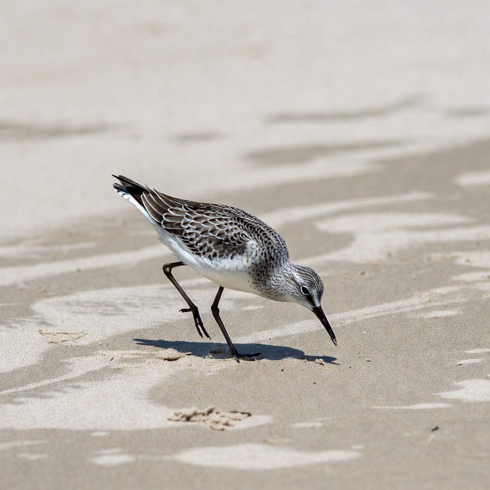 A small sanderling bird with gray and white plumage stands on wet sandy beach. It bends its neck to peck at the sand with its thin black bill. Footprints and shallow water marks are visible in the background.