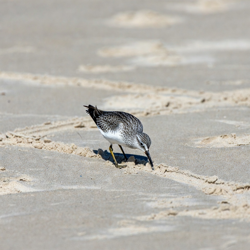 beach, bird, black bill, footprints, foraging, gray feathers, isolated background, nature, ocean shore, probing, sand, shorebird, white belly, wildlife, yellow legs, sanderling