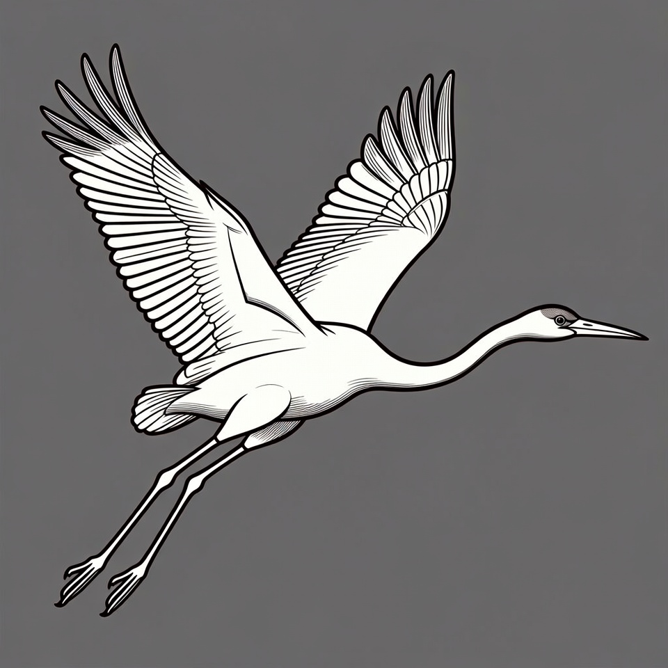A detailed line art illustration of a white heron flying with wings spread wide. The bird has long legs extended backward and a slender neck with a pointed beak. It is depicted in white on a solid gray background.