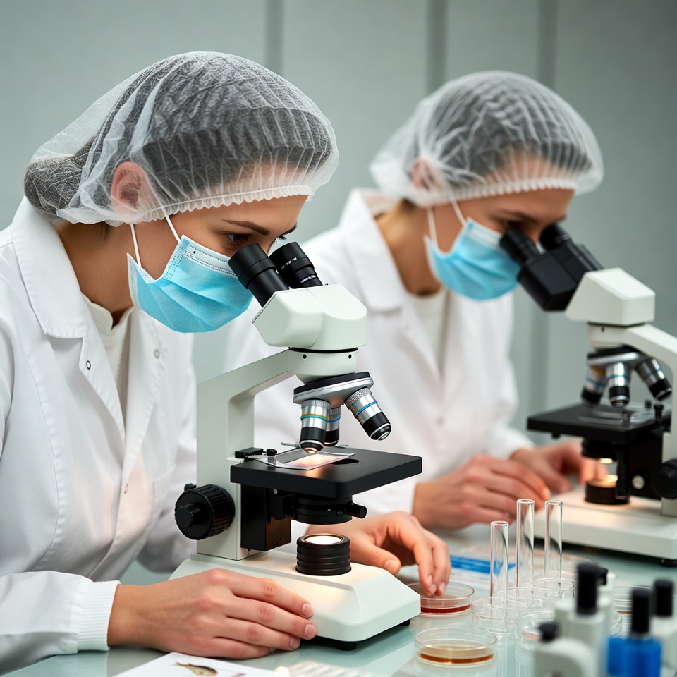 Two women in white lab coats and hairnets examine samples through microscopes in a laboratory. They wear blue face masks and focus on petri dishes, test tubes, and lab equipment on the workbench. The setting features a clean lab environment with scientific instruments.