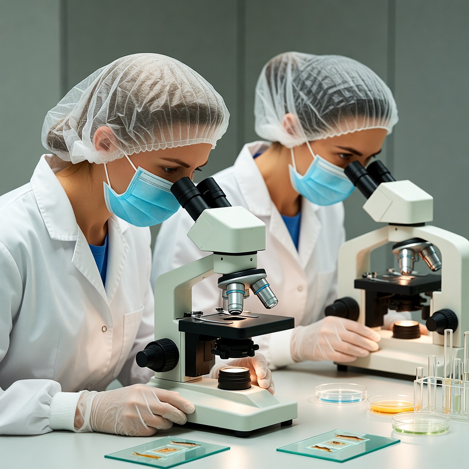 Two women in white lab coats, hairnets, and blue masks examine samples through microscopes at a lab bench. They wear gloves while handling petri dishes, test tubes, and slides under bright lighting. The modern laboratory features gray walls and organized equipment.
