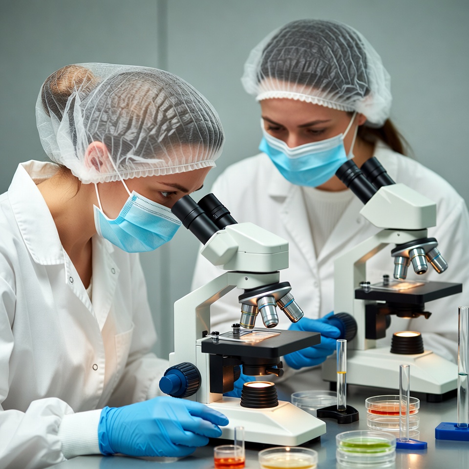 Two women in white lab coats, hairnets, blue gloves, and masks examine samples through microscopes in a laboratory. They lean over the equipment with petri dishes, test tubes, and colored liquids on the table. The setting features a clean lab bench with scientific tools.