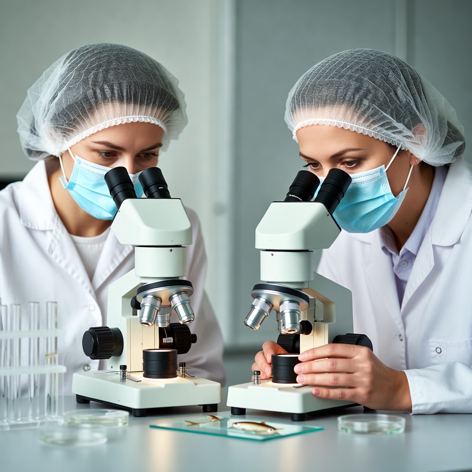 Two women in white lab coats, hairnets, and blue face masks examine specimens through dual microscopes on a lab bench. Test tubes, petri dishes, and glass slides with samples are visible on the table. They focus intently on the microscope eyepieces in a laboratory setting.