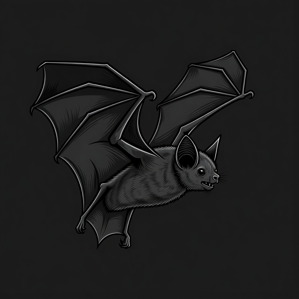 A detailed black and white illustration of a bat with large spread wings flying against a dark background. The bat features pointed ears, sharp fangs, and textured fur. It is rendered in a bold line art style with high contrast shading.