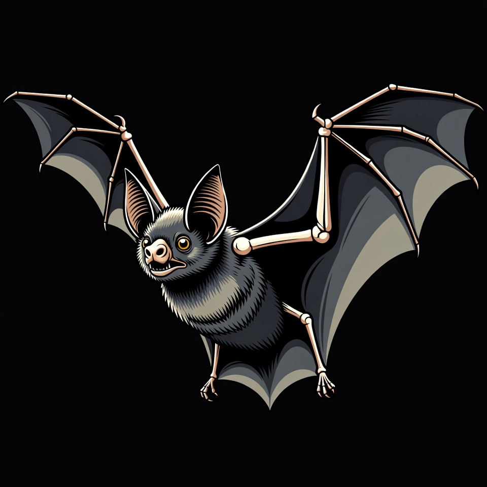 A detailed black and white illustration of a bat with exposed skeleton bones flies with large spread wings. The bat features a snarling face, furry body, and bony limbs against a solid black background. The artwork uses intricate line work in a vintage style.