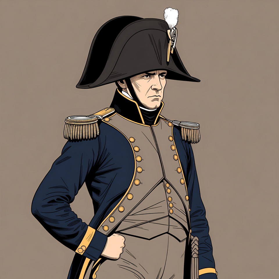 An illustration of Napoleon Bonaparte standing in a three-quarter view. He wears a black bicorne hat with a white plume and a dark blue Napoleonic military uniform with gold epaulettes and braiding. His hand is tucked into his coat against a plain beige background.