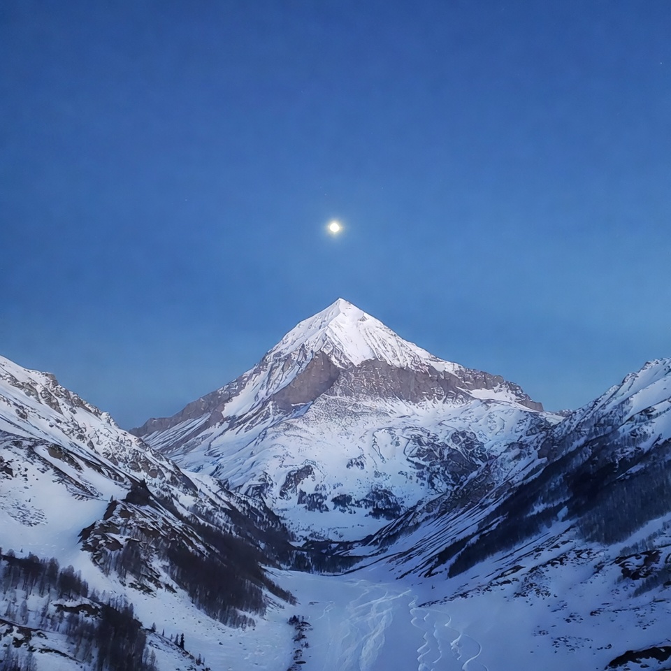 Alps, blue sky, dusk, full moon, glacier, high altitude, moonlight, nature, night sky, outdoors, peak, ridge, scenic view, snow, snowy peak, summit, trees, valley, white snow, winter landscape, mountain